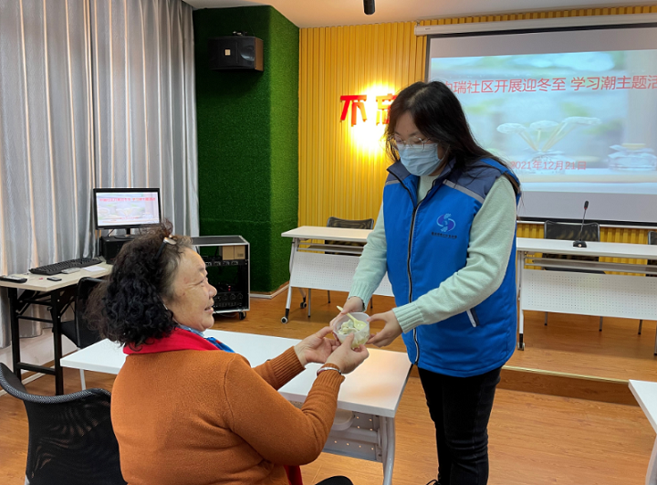 在活动现场看到,中瑞社区网格员和迅捷养老服务中心的工作人员们为居民们送上热气腾腾的饺子。中瑞社区网格员王晶开端着热气腾腾,盛满饺子的碗,热情地说道:“李阿姨,给您送一碗饺子,祝您冬至快乐!”工作人员看着一碗碗水饺端到居民手中,居民朋友们一边吃着,一边有说有笑地交流着,别提多有滋味了。