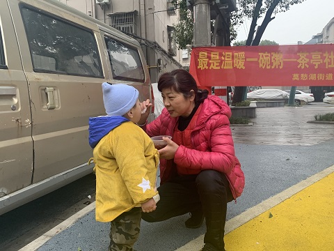 腊八节当天,喝上一碗热气腾腾、用料实在的腊八粥,是不少莫愁湖街道茶亭社区居民每年惦记的事儿。2022年1月10日早上6点40分天刚蒙蒙亮,茶亭社区党委书记齐红云带着社工和党员志愿者分别来到茶亭村小区、玉塘村小区、湖心花园小区为上学的孩子们和赶早上班的社区居民送上暖心的腊八粥,并给他们带去浓浓的节日祝福。