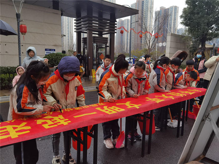 活动过后,“雏鹰小队”的同学们在志愿者的带领下,来到朗诗熙华府小区,向小区内的居民宣传普及垃圾分类知识,在宣导条幅上签字,领取劳动工具到楼道打扫,同学们干得热火朝天,不亦乐乎。