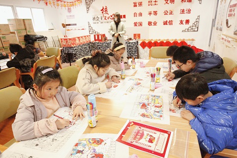 活动现场,各民族青少年一同体验传统木版年画的风采,红彤彤的木版年画,映衬着社区迎新年的吉庆装饰,烘托出浓郁的传统新年气氛,传统木版年画在内容上多以“和”为主,形式上展现了民俗之美,无论文化内涵和精神外延上,都为社区各民族青少年营造了“家”的氛围。