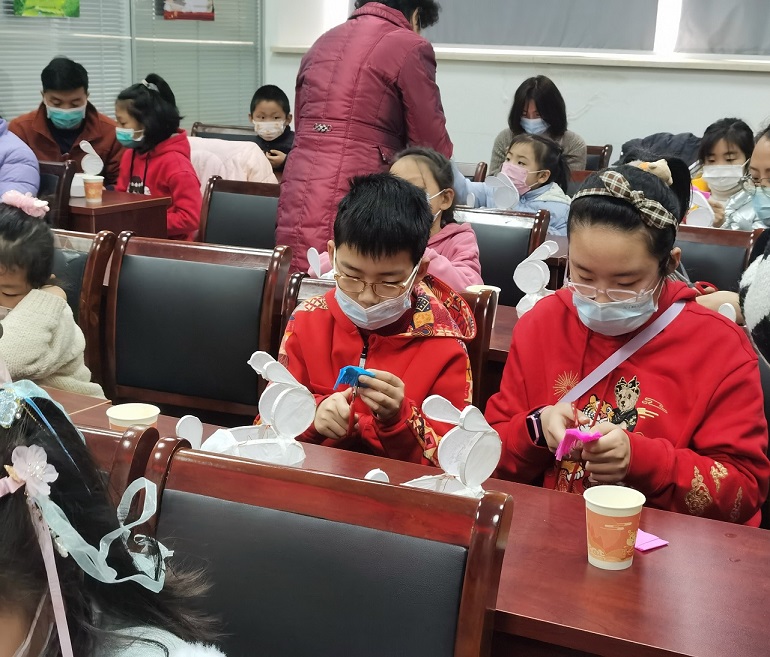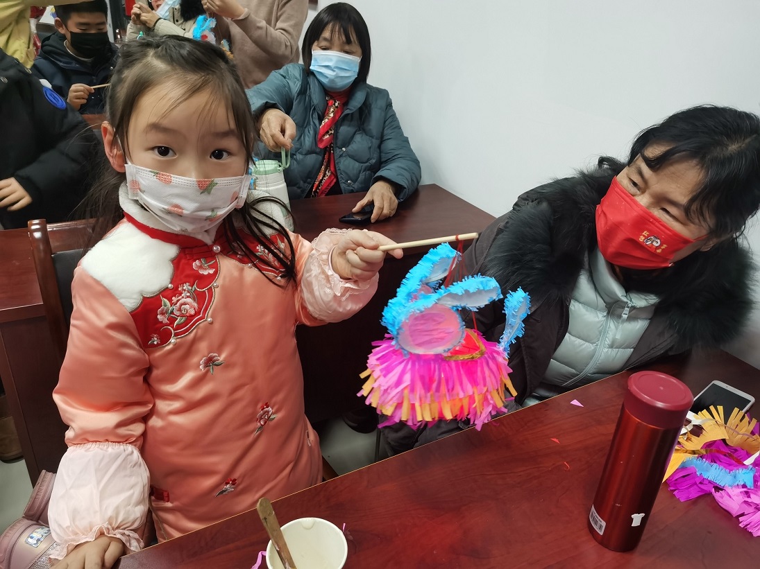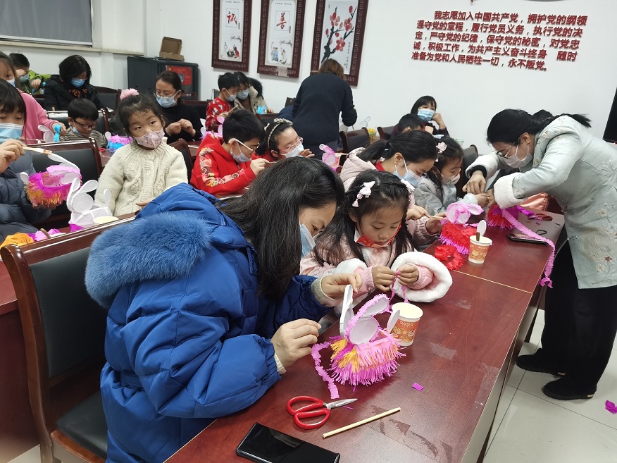 由于兔子灯本身外形娇俏可爱,同时寓意着吉祥、好运,到场的小朋友们情绪都非常热烈和积极,制作灯笼的大部分步骤都是小朋友们独立完成的,遇到个别复杂环节时,老师和孩子家长也会给予耐心的指导和帮助,大家一起拼接、组装、黏贴灯笼。随着灯笼的零配件都组装好,一只只漂亮的兔子花灯就做好了。打开电源开关,灯光照映着灯笼上的图案,透出朦胧又柔和的光晕。居民陈阿姨手提兔子灯,对孙女糖糖说:“兔子代表的是月亮里的玉兔,正月十五既是佳节,又是月圆之时,这个兔子灯表达了我们普通老百姓对于阖家团圆的美好期盼啊。”她的语速非常徐缓,温柔的声音里溢满了对后辈的疼爱。