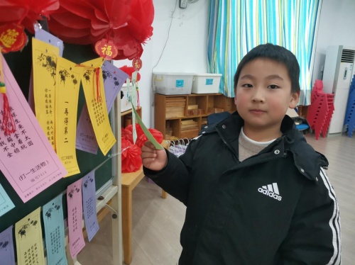 当天活动现场,志愿者还精心准备了50余条极具知识性、娱乐性的谜语悬挂在宣传墙上,谜题包括字谜、成语谜、地名谜等。随着一条条彩色的谜语迎风摇摆,小朋友和老师们进了纷纷开动脑筋,你一言我一语,沉浸在猜灯谜的喜悦之中。