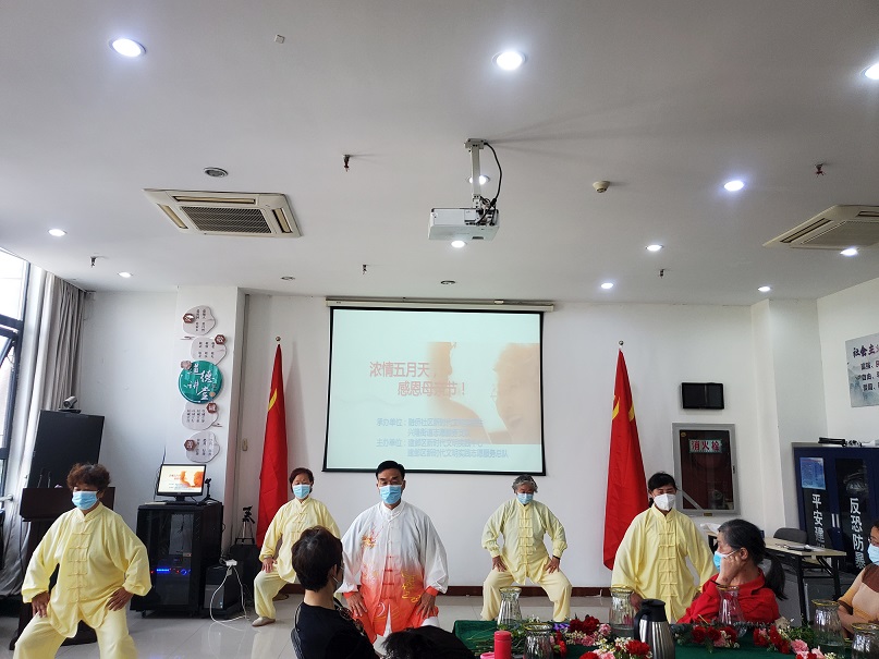 本次活动邀请社区太极拳队为在场的妈妈们表演了精彩而又养生的节目--八段锦,随后一场手工插花把本次活动推向了高潮。花艺老师精心准备了康乃馨、满天星、太阳花等鲜花,并向妈妈们介绍了家居插花和鲜花的保养技巧,大家一遍认真听老师讲解,一遍动手选材、裁剪、搭配,很快完成自己的插花作品。整个活动现场弥漫着鲜花的香气,气氛温馨而热闹。