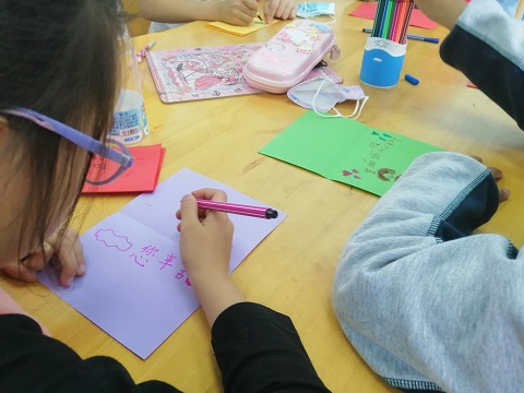为了通过自己的行动来感恩身边默默付出的劳动者,孩子们用卡纸绘制一张张感恩贺卡。简单的图案,稚嫩的字迹,孩子们通过一笔一划表达着心中对劳动者们最真挚的情感。刘同学完成后积极和大家分享她的贺卡内容:“我是写给王老师的,她是我们的语文老师,对我们每一个人都很好。”林同学则是想要送给自己的妈妈,感恩她为自己的付出。通过绘制一张感恩贺卡,孩子们学会了留心身边的劳动者,看到他们的劳动和服务,明白这些劳动者的工作是平凡的,却用自己的劳动创造出了不凡,并且培养了孩子们懂得感恩的意识。贺卡绘制完成后,孩子们在上面写下了自己的名字交给社工,向身边的劳动者送出他们的感恩。