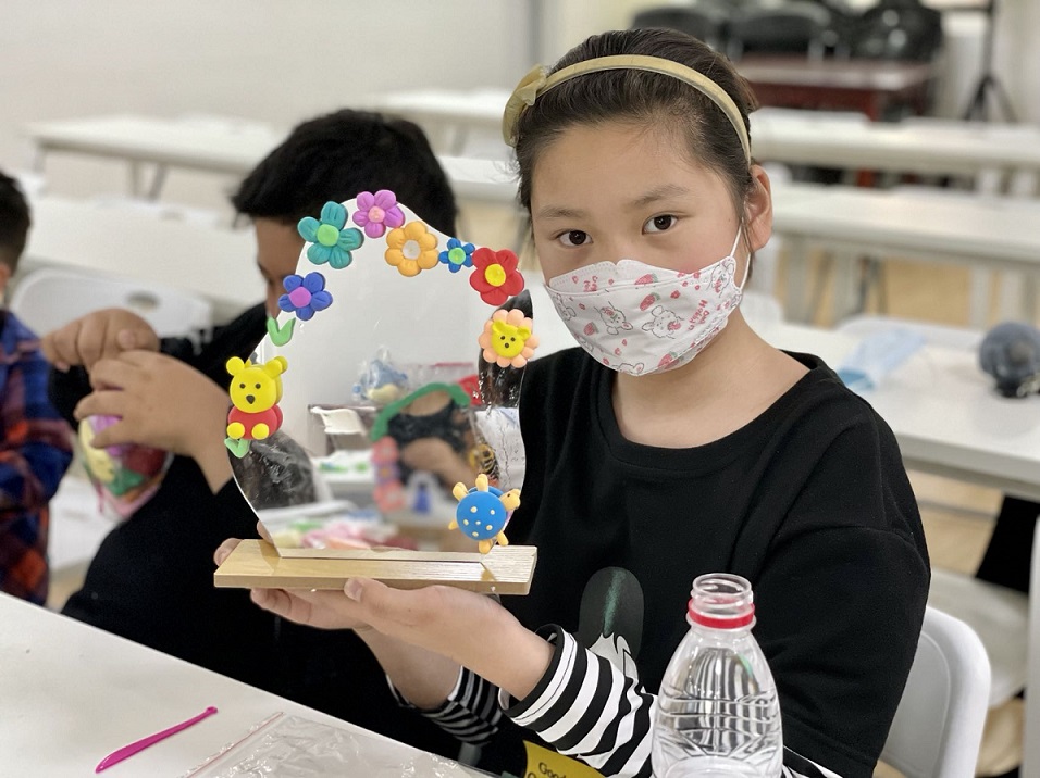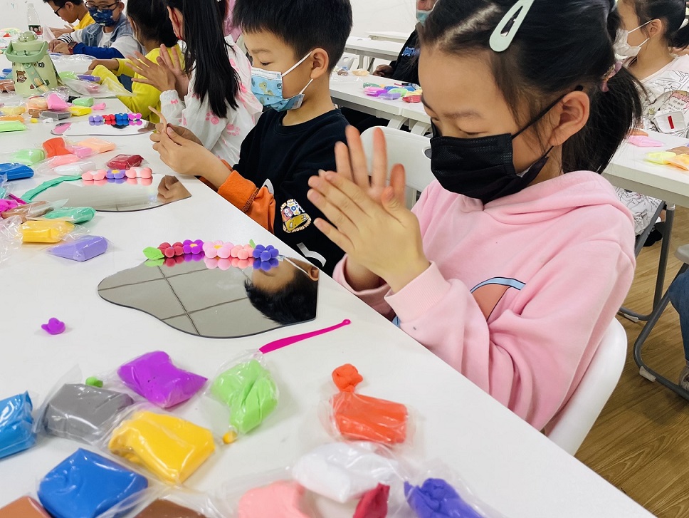 接下来,就是孩子们的节气手工时间,孩子们这次要做的是“满花镜”。在制作过程中,孩子们将粘土切成等份并搓成小球,将小球组成一朵小花,用小刮刀轻轻压出花瓣的纹理,再粘在镜子上。孩子们聚精会神用心制作属于自己的“满花镜”。