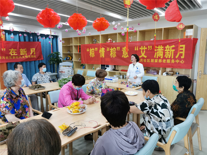 5月31日上午,新月社区携手迅捷居家养老服务中心开展“文明端午,艾在新月”活动。具有传统文化内涵又富有创意的趣味活动吸引了社区老年居民积极参与,大家一起包粽子、钩织鸭蛋网、制作香囊,忙的不亦乐乎,整个活动现场一片欢声笑语,其乐融融。同时,社区特邀双闸社区卫生服务中心洪梅主任就“新冠”疫苗接种问题为老年人现场答疑,并推广家庭医生签约服务,受到了老年人的热烈欢迎,大家纷纷提问,洪主任一一耐心解答。