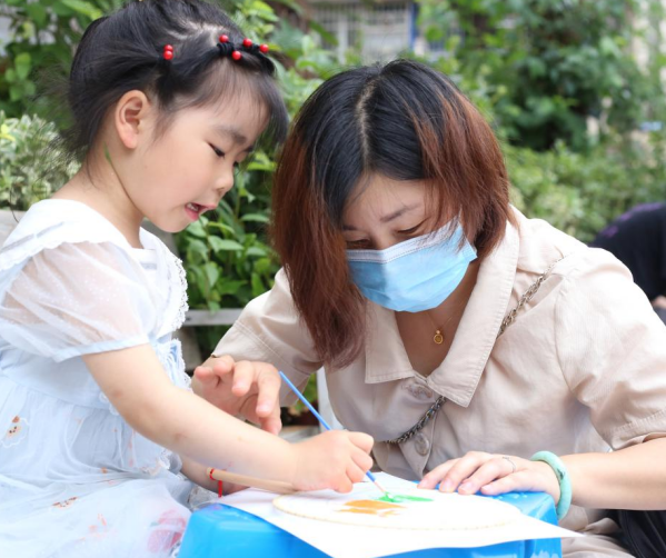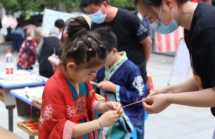 活动现场分为了多个体验区,包粽子、画团扇、编五彩绳、佩香囊,现场还为居民们请来了乾生堂的中医前来义诊。青少年们着上心爱的汉服,在爸爸妈妈的陪同下,画团扇,编五彩绳,忙的不亦乐乎。观察、调色、比照、下笔勾画,青少年们细细描绘,父母则纷纷放下手机,在一旁或一起绘制,或细心指点,或欣慰旁观,或与小朋友配合完成五彩绳的编制,温馨的气氛萦绕其中。刘姓家长说,社区组织这样的活动非常好,给孩子们一个浸润式的氛围体验端午千年积淀下来的文化,让孩子们感受传统文化的魅力,让家长有一个高品质陪伴的机会。