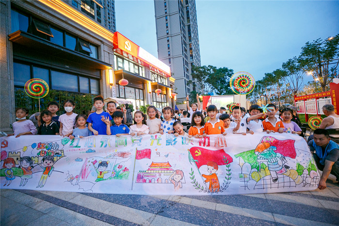 首先,一幅空白的画卷在20位小朋友面前展开,一双双小手,一根根画笔,逐渐呈现出五彩斑斓的“童心向党百米画卷”。快乐袋鼠跳、趣味投壶、射箭小达人、真人飞行棋的环节也吸引了众多居民的参与,在一片欢声笑语中喜迎七一的到来。然后,电影公映许可的BGM响起标志着电影正式开始,一颗颗童心也在此时安静的坐下来,认真的观看《建党伟业》。