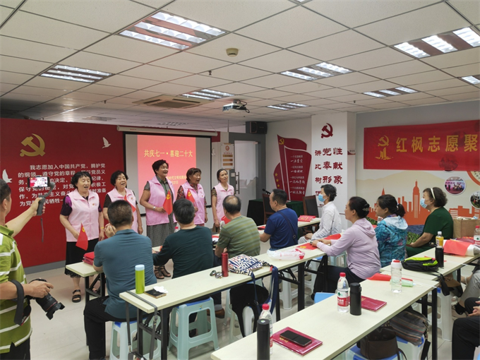 颂歌献给党,建功新时代。“我和我的祖国一刻也不能分割,无论我走到哪里都流出一首赞歌,我歌唱每一座高山我歌唱每一条河,袅袅炊烟小小村落,路上一道辙。”一首《我和我的祖国》响彻在香山路党群服务中心,社区党员、志愿者们用歌声表达了对祖国、对党的深情祝福。“一家亲”党员志愿者们即兴演唱的《我们共产党人好比种子》更是唱出了党员志愿者要像“种子”一样,由小到大,有少到多,不断发展壮大。