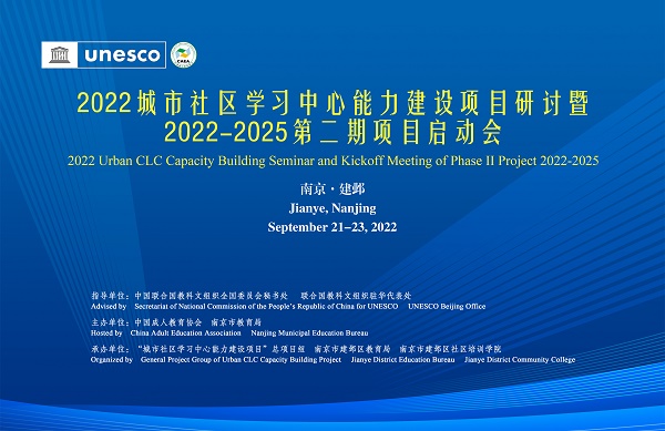 推进社区教育,建设学习型城市!9月22日,城市社区学习中心(CLC)能力建设项目研讨暨2022-2025第二期项目启动会在南京市莫愁中等专业学校召开。本次会议由中国联合国教科文组织全国委员会秘书处和联合国教科文组织驻北京办事处指导,中国成人教育协会、南京市教育局主办,建邺区教育局、南京市莫愁中等专业学校、南京市建邺区社区培训学院承办。