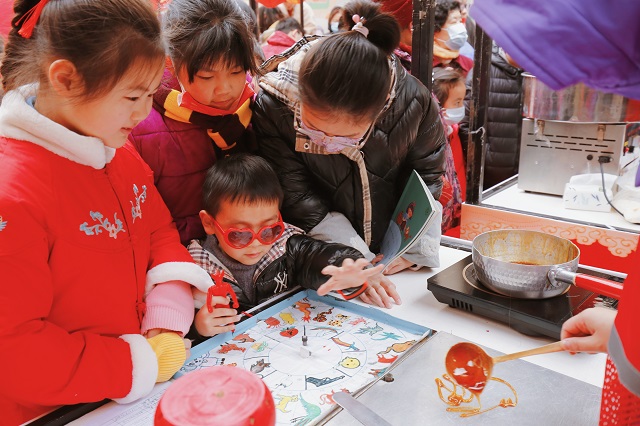 活动现场,小朋友们带着自己最喜爱的图书,和其他小朋友们进行图书互换交友。社区志愿者们也为大家准备了各种非遗民俗展区,有画糖画的,有制作棉花糖的,有雕版、活字印刷,有脸谱等等。孩子们看着琳琅满目的展区,一个个难掩兴奋之色,争相体验自己感兴趣的展区。
