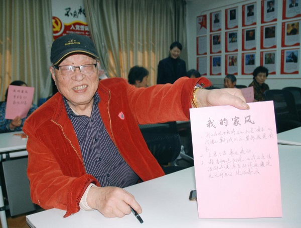 活动开始,钱老师通过“我手写我心”家风传承分享互动小游戏,带领社区居民一起写下“我心目中的优秀家风家训”,大家积极参与。有位老大爷写得尤为仔细认真,他说他所传承的好家风是“爱读书,热爱生活“,他分享道:“现在退休了,但是平时会和兴趣相投的朋友一起组织文艺活动,即丰富了自己的业余生活,同时也给孩子做出好的榜样。”