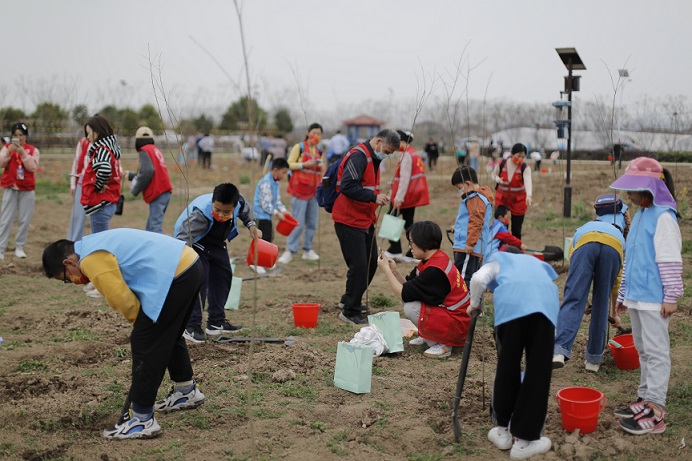 老师讲解结束后,大家纷纷拿起铁锹、铲子、水桶等植树工具,在老师的带领下开启植树环节。只见孩子和家长们分工协作,有的扶着树苗,有的挖土,有的浇水,现场秩序井然,寓教于乐,孩子们也在有趣的动手环节意识到了植树环保的重要性,是一堂记忆犹新的人生课堂。眼看一棵棵鲜嫩翠绿的小树苗齐齐地“站”了起来,在阳光下迎风摇曳,家长和孩子们都喜笑颜开。