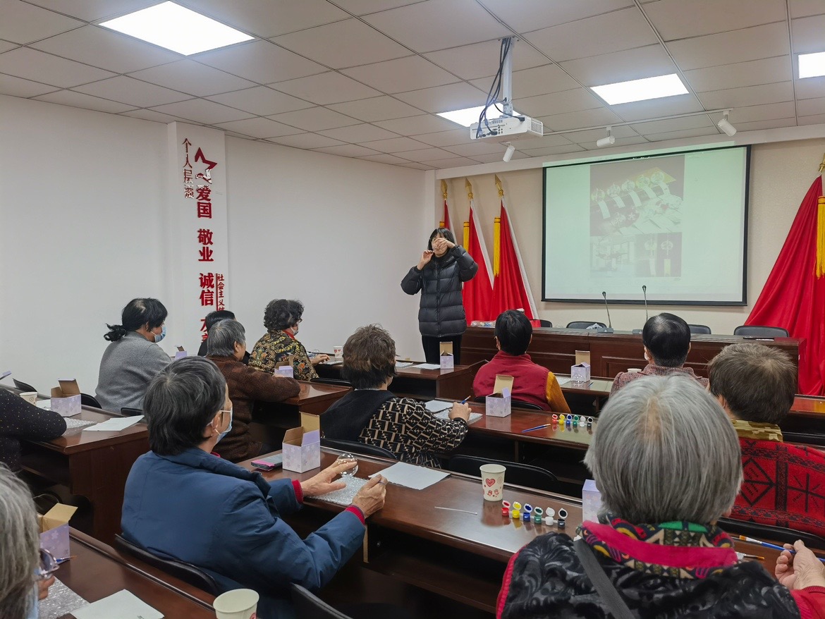 活动当天,老师首先向大家简单介绍了风铃的由来和历史发展,让居民们欣赏了一些五颜六色,图型多变的风铃照片,然后将制作风铃的材料分发到居民们手中。活动过程中,居民们都很认真,拿着画笔、颜料和铃铛等材料,按照老师说的步骤,慢慢完成自己的风铃。经过了一个多小时的制作,一个个色彩不一的手工风铃呈现在大家眼前,微风徐来,拂过手中的风铃,发出一阵一阵灵动而轻快的旋律。