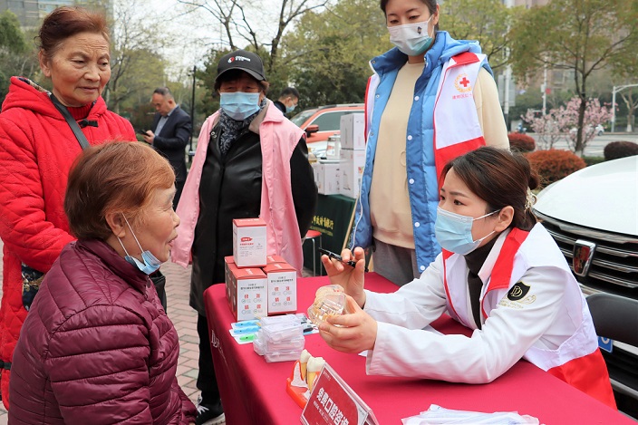 健康义诊,情满社区。现场,社区红十会的医护志愿者们认真细致地为社区居民检查身体,测量血压、血糖等。针对老年人口腔易清洁不到位,容易出现各种口腔问题的情况,红十字会志愿者免费帮助社区居民检查牙齿等口腔方面的问题。针对检测出来的问题,细心嘱咐居民该如何去治疗,提醒他们平时注意饮食,养成健康的生活作息习惯和生活方式,并用通俗易懂的语言,解答社区居民日常生活中遇到的各种疑难问题,积极引导居民科学就医,提高社区居民的自我保健和防病意识。