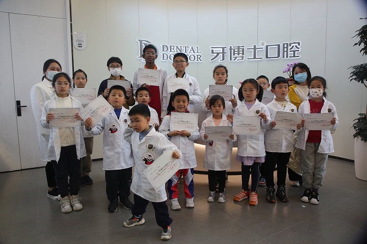 牙博士专家提醒广大市民,一定要从小培养孩子爱护牙齿的习惯,关注孩子牙齿健康问题,如出现牙齿疼痛、变黑、未按时换牙等情况,需及时就医。活动最后,牙博士口腔王医生给小朋友发放证书及合影留念。