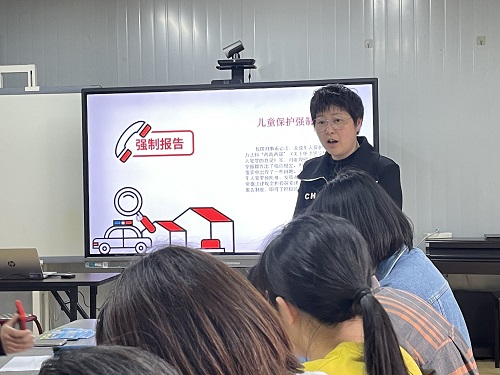 未成年人是祖国未来的花朵,也是社会上的弱势群体,作为密切接触未成年人的教师,更应当为他们营造一个安全健康的环境。为了更好的贯彻执行“北圩路社区未成年人侵害案件强制报告制度建设”,宣传法治精神,4月11日,北圩路党群服务中心和南京市建邺区心之初老年人心理健康服务中心根据强制报告的相关内容,联合为茶亭幼儿园的教职工们开展强制报告知识宣传活动。