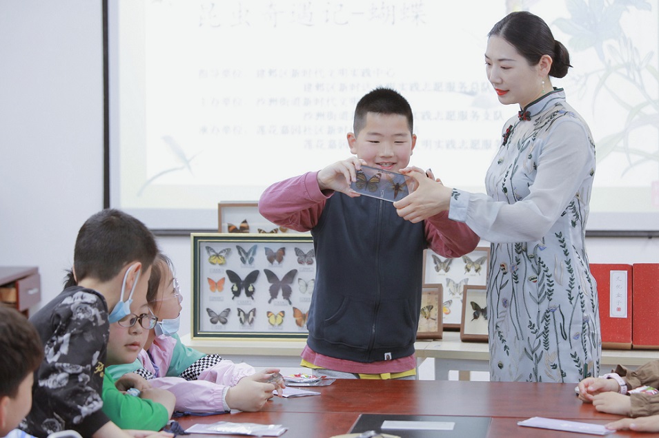 接着便到了手工环节,这次的活动是“蝴蝶标本的制作 ”。 志愿者老师用生动的语言讲述了蝴蝶知识,比如身体结构、外形特征、生活习性等等,并将环保知识贯穿于课堂之上,让孩子们了解大自然的同时也增强了环保意识。随后,在志愿者老师和“五老”的指导下,孩子们发挥自己的想象力,经过一个小时的创作,一只只漂亮的蝴蝶标本完成了,孩子们互相欣赏着作品,享受着成功的喜悦。