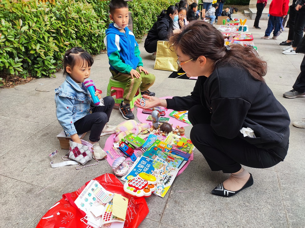 不多时,每位“小摊主”摊位上的旧书本、玩具和画笔等抢手的物品就被小区内捧场的叔叔阿姨们以“美丽”的价格纷纷拍下,有的“小摊主”就开始互相走动,相中了其他小伙伴摊位上的物件,商议着用自己的物品去交换,彼此之间你来我往有商有量,完成了一次次友好的互助互换。