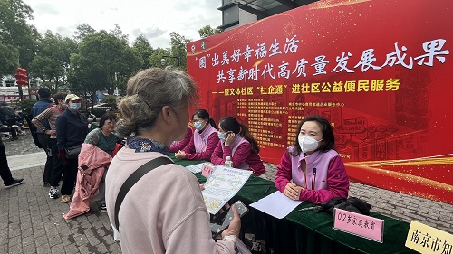 公益市集现场,文体社区志愿者提供的理发、缝纫、修补、磨刀、配钥匙等便民惠民服务,满足了居民日常需求;共建单位南京第五幼儿园、建邺区司法局莫愁湖司法所、南京市禁毒办、南湖社区卫生服务中心等提供的健康检测、法律咨询、0-2家庭教育、禁毒科普、垃圾分类等便民公益服务展台前排满居民;朱桂山老鹅、樱桃鸭、紫雁大米、金陵蚊香、巧白洗涤用品等本地名特优新产品竞相亮相;金银细工、南京绒花、剪纸、灯彩等非遗小课堂吸引市民们驻足观看,大家聊家常、尝瓜果、试新货,买产品,享受着一刻钟便民生活圈的便捷、快乐、实惠。
