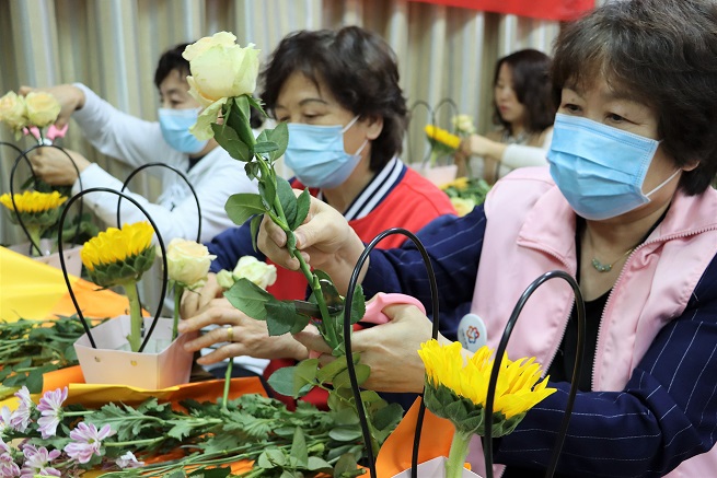 活动现场,社区特邀专业花艺老师向大家讲授插花技巧,色彩搭配等知识。随后,大家领取了插花所需的各种材料,跟着老师的节奏,在花香四溢和欢声笑语中,纷纷行动起来。黄色的玫瑰、粉色的康乃馨,绚烂的向日葵……一朵朵鲜花在各位母亲的巧手下变得错落有致。经过一个多小时的创作,一捧捧灿烂缤纷、新颖别致的插花作品展现在眼前。大家手捧鲜花,笑靥如花,脸上洋溢着幸福感和成就感,共同迎接浪漫温馨的母亲节来临。