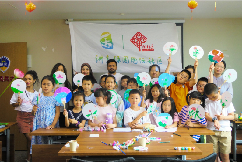 在活动现场,主持人为居民们介绍了中国节气文化, 并重点讲解了“大暑”的来历和习俗,中外居民纷纷感慨节气真是中国古代劳动人民的伟大创造, 其智慧与内涵让人折服。在“扇面画体验”活动环节,民俗老师向社区居民们介绍了团扇的历史、形状、结构等知识,居民们争先恐后,踊跃参与其中。因时值夏天,荷花盛开,活动室便以荷花荷叶布景,把团扇的创作主题定为“爱荷说”。孩子们和关工委志愿者代表们在老师的指导下,大胆构思, 精心设计,不一会儿,空白的团扇、颜料、水彩笔等材料和工具便制作为了姿态各异的精美“荷花扇”。关工委“五老”志愿者田美华特意在扇面上写下了自己最喜欢的一句古诗词“惟有绿荷红菡萏,卷舒开合任天真”,外籍居民Norman用英文写下“Summer is so beautiful”(夏天真美丽)。随后,参与活动的孩子们和“五老”志愿者代表们拿着荷花团扇合影留念,纷纷为此次活动点赞。