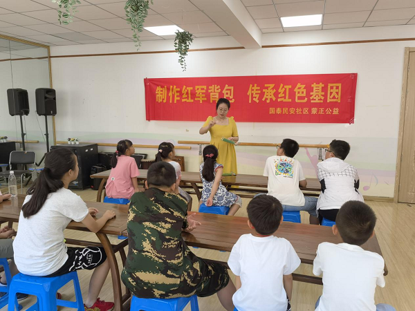 为了激励青少年对祖国的热爱,培养青少年的历史责任感,2023年7月18日上午,国泰民安社区联合蒙正公益开展“制作红军背包 传承红色基因”红军包手工制作活动,活动邀请了十多位青少年参加,现场热闹非凡。