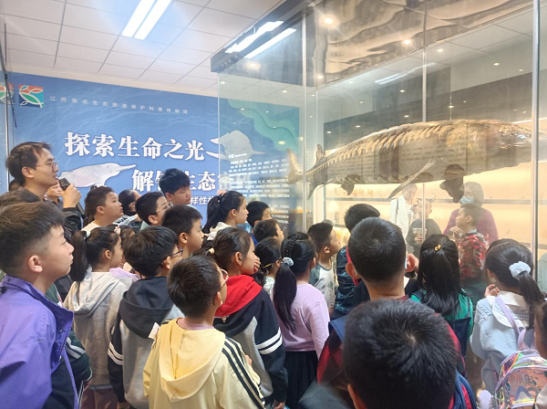 馆内展出了研究所自成立以来收藏的淡水水生生物标本。同学们手拿纸笔,认真聆听老师的细致讲解,全面了解了具有江苏特色的渔业资源情况,认识了世界上12种最濒危的动物之一,素有“水中大熊猫”之称的白鱀豚,国家一级重点保护野生动物,水中活化石中华鲟,以及鲥、鯮、胭脂鱼等数种珍稀的鱼类标本。孩子们被这些“稀奇古怪”的鱼类标本紧紧地吸引住,时不时发出感叹。