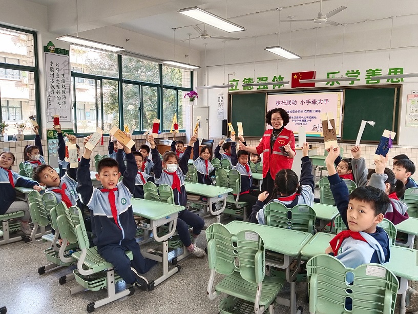 一大早,志愿者们走进辖区内中华附小,向同学们介绍了垃圾分类三周年的工作成果,告诉大家我们取得的每一份成绩都离不开同学们的贡献,倡导同学们继续从点滴做起,从身边做起,让垃圾分类让垃圾分类“习惯成自然”。在随后的垃圾分类小常识互动环节中,同学们踊跃参与,迅速作答,志愿者们为答对问题的同学送上了他们亲手制作的书签,鼓励所有同学争做垃圾分类的践行者,城市管理的“小主人”,通过“小手拉大手”带动家长们做好垃圾分类示范榜样作用。