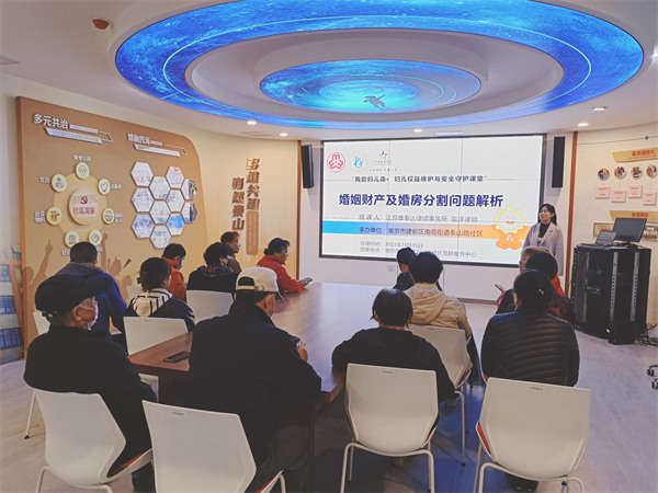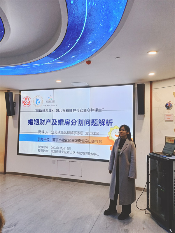 为进一步倡导平等、和睦、文明的婚姻家庭关系,推进妇儿法治宣传教育工作,营造“人人懂法,以法护家”的法律氛围,11月15日,泰山路社区在南京市妇联、南京市律协的支持下,特邀江苏博事达律师事务所专业律师袁洋为社区家庭带来“我助妇儿康·妇儿权益维护与安全守护课堂”婚姻财产及婚房分割问题解析法律知识讲座。