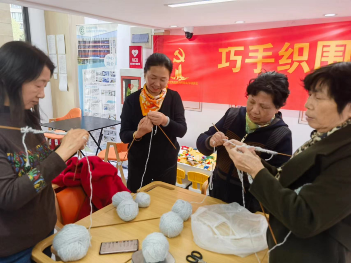 ”活动。居住在各小区的阿姨志愿者们每天早早来到社区养老中心,有说有笑,互相交流编织技巧,柔软的毛线在一双双巧手间飞舞,一针针都承载着满满心意。社区网格员与全职妈妈志愿者们一起将爱心围巾送到辖区老党员、高龄、独居老人手中,暖心询问他们的身体、生活情况,提醒天气寒冷要注意防寒保暖,让老人们感受到社区大家庭的浓情暖意。