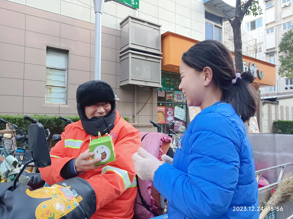 岁末将至,寒潮未尽,2023年12月24日下午,一场名为“传递爱心,送上吉祥”的公益活动在国泰民安社区热烈展开。本次活动由多个亲子家庭共同参与,他们以实际行动向辛勤工作的宁小蜂驿站快递员和环卫工人表达了深深的敬意和感谢。
