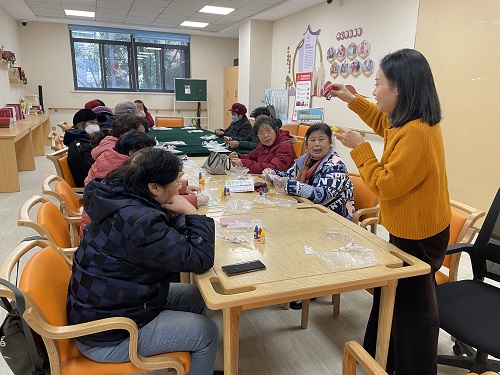活动现场,老师为社区居民讲解了扎染的相关知识。扎应读“zā”,很多人会错读成“zhā”。分享了扎染的历史由来以及不同扎染方法的特点,现场也准备了方便操作的点染的材料,让社区居民现场体验。居民们热情高涨,积极参与,调配出自己喜欢的颜色,制作出一幅幅独一无二的自己喜欢的扎染作品。