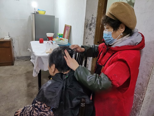 在便民服务区,志愿者们一边为居民提供理发、修伞、修鞋、磨刀、移动网络办理等便民服务,一边耐心地与居民们聊天,了解他们的生活状况和各种需求。此外,针对行动不便的老人特别安排上门理发服务。