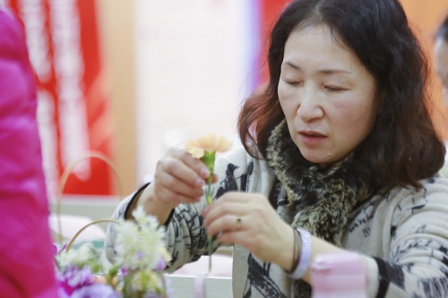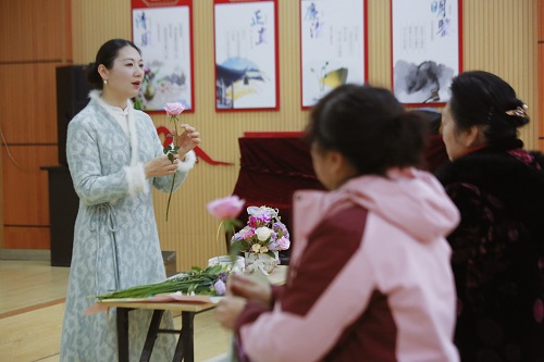 活动现场充斥着四溢的花香。老师首先给予了祝福并初步讲述了中西式插花文化,老师围绕插花艺术的发展史、花材的选择、插花的造型和基本插作技巧、色彩配置、花材的保鲜等内容进行了详细地讲解。随着支支花材插入花泥,漂亮的“花篮”渐渐有了雏形。落座的女性居民们也是听得津津有味。