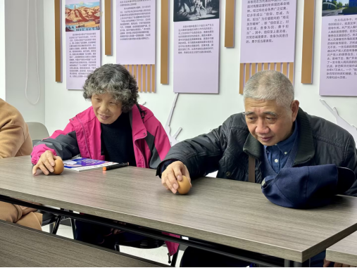 “春风到,蛋儿俏”,春分节气少不了立蛋这项活动。春分这一天是白天和夜晚的平衡,鸡蛋站立的稳定性最好;而且春分正值春季中间,不冷不热,花红草绿,人心舒畅,思维敏捷,动作利索,也易于操作成功。介绍过活动规则后,大家跃跃欲试。在立蛋之前,大家先拿着五颜六色的水彩笔在鸡蛋上画出各种表情图案,然后拿着鸡蛋小心翼翼地在桌面上尝试着,先开始试了几次都没有成功,后来经过几次琢磨,掌握了技巧终于把鸡蛋立了起来。吴老和大家分享了小窍门:立鸡蛋前先摇晃一下,使鸡蛋里“气泡”朝上,立的时候,鸡蛋大头朝下,这样鸡蛋重心低易平衡。集中精力在指尖,选好支点,直到不倒才松手。