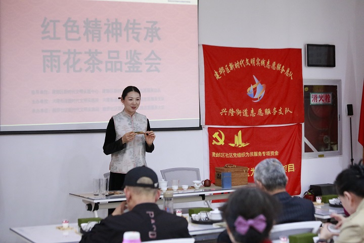 活动开始,老师为居民们讲解雨花茶红色文化精神并分享了雨花茶的独特魅力。居民们听得津津有味,不时点头表示赞同。在老师讲解中,大家知道“雨花茶外形紧细圆直,锋苗挺秀,形似松针,犹如紫金山上的雪松翠绿挺拔,象征着革命先烈不惧牺牲、万古长青的精神,有着“‘红色’的绿茶”之称。”在老师的讲解下,大家感受到了雨花茶背后的历史底蕴和红色传承。