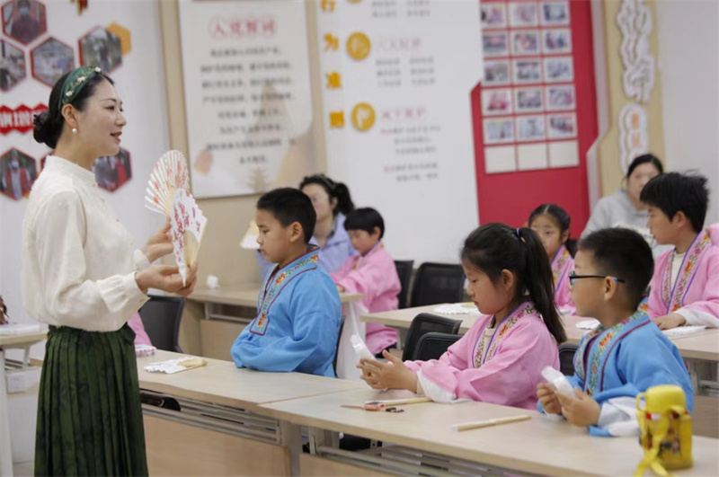 南京理工大学的大学生志愿者为孩子们分享了汪曾祺等名家笔下的戏曲印象及自己儿时看戏的经历,与孩子们产生了共鸣。戏曲道具手工扇子制作环节,志愿者为孩子们发放材料包,孩子们在老师的指导下,充分发挥想象,绘制出一把把精美的彩绘戏曲扇。孩子们将扇子置于面前,比划着刚学到的戏曲表演动作,现场氛围欢快温馨。