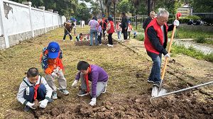 有的小朋友也已经开始有模有样地学习起来了,看着他们小小的身躯拿着铁锹,真的让人忍俊不禁,像极了一个小男子汉。一些年龄更小的小朋友们也开始对开垦出来的石块进行分拣,他们正在区分泥块和石块。在泥土的色彩和碧绿的野草衬托下,孩子们的红领巾是那样的可爱,志愿者们的红马甲是那么的鲜艳。这一抹可爱的红色,像极了优良传统与奋斗精神的传承。