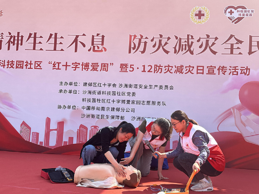 为进一步扩大红十字会的社会影响力,提升社区居民的防灾减灾意识增强自我保护能力,更好地守护人民的生命与健康,5月8日下午,科技园社区联合建邺区红十字会、沙洲街道安全生产委员会、科技园社区红十字博爱家园志愿服务队、中国移动南京建邺分公司、沙洲街道民生保障部、沙洲街道司法所共同开展“人道精神生生不息 防灾减灾全民参与”——科技园社区“红十字博爱周”暨“5·12”防灾减灾日宣传活动。