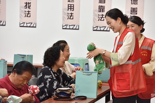 接下来,居民们又学习了母亲诗词手势舞,并开展了艾草经络锤的DIY活动。大家将收集来的旧布料平摊在桌上,将艾草放在中间,用布料包裹住,随后捏成一个紧实的球体,拿出绳子将剩余的布料紧紧捆绑成柱形,一个个实用美观而环保的艾草经络锤便制作完成了。现场,老师还带领居民们一起跳起了艾草锤养身保健操,欢笑声不绝于耳。