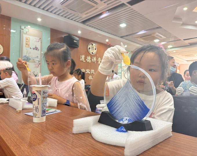 活动伊始,志愿者老师向亲子家庭介绍了流沙画的来历、颜色搭配、制作步骤及方法。在志愿者老师的指导下,家长和孩子们按照自己的喜好选择流沙,用漏斗、小勺、细长针等工具让不同的沙砾匀速流入透明的玻璃圆框中,随着混合溶液以及封口胶的注入,一幅幅层次分明、极富美感的流沙画就大功告成了。大家都互相展示着自己的作品,享受着成功的喜悦,每个孩子脸上都洋溢着快乐的笑容。“今天带孩子来参加这个活动,不仅让孩子学到了新知识新技能,同时感受到手工制作的魅力,体验到完成自己作品的成就感及艺术创造带来的乐趣,特别有意义!”活动结束后,一位家长这样说道。