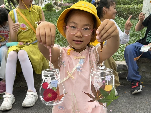 活动中孩子们利用公园捡拾的落叶、散落的花瓣,制作精美的环保书签。这些书签有的以落叶为主,搭配几瓣颜色艳丽的花瓣,呈现出宁静与美好;有的则以花瓣为主,搭配几片绿叶,显得生机勃勃。书签上的每一片落叶、每一朵花瓣都经过孩子们的精心挑选和搭配,既展示了他们对自然美的热爱,也传递出绿色环保的理念。