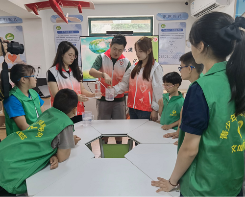 青少年志愿者王梓锡向大家分享了自己家中使用的明矾净水小妙招,向污染的水中加入明矾并搅拌、静置,明矾会聚结胶粒,使水变得清澈干净。