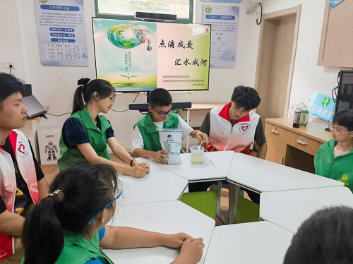 “日常生活中,大家知道有哪些节水方式吗?”“洗完手要关好水龙头。”、“平时洗脸用盆接水。”来自东南大学的志愿者首先分享了《节水用水条例》相关内容,并通过提问方式和青少年志愿者交流了日常生活中的接水方式。大学生志愿者从自身专业出发,用矿泉水瓶、吸管等常用生活用品制作了不用电就能进行水循环的装置,并解释其中的压强原理,令青少年志愿者受益匪浅。