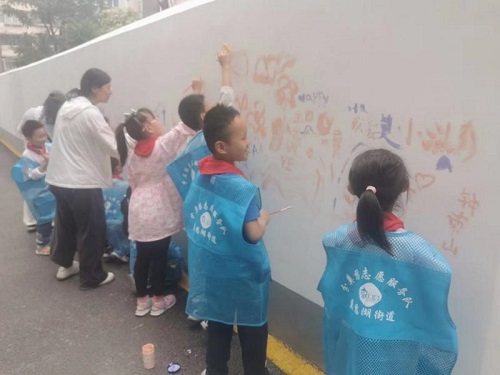 莫愁湖社区与辖区内的莫愁湖小学开展共建活动,通过世界水周知识问答活动、墙面喷绘环保画的方式,培养孩子的环保意识。