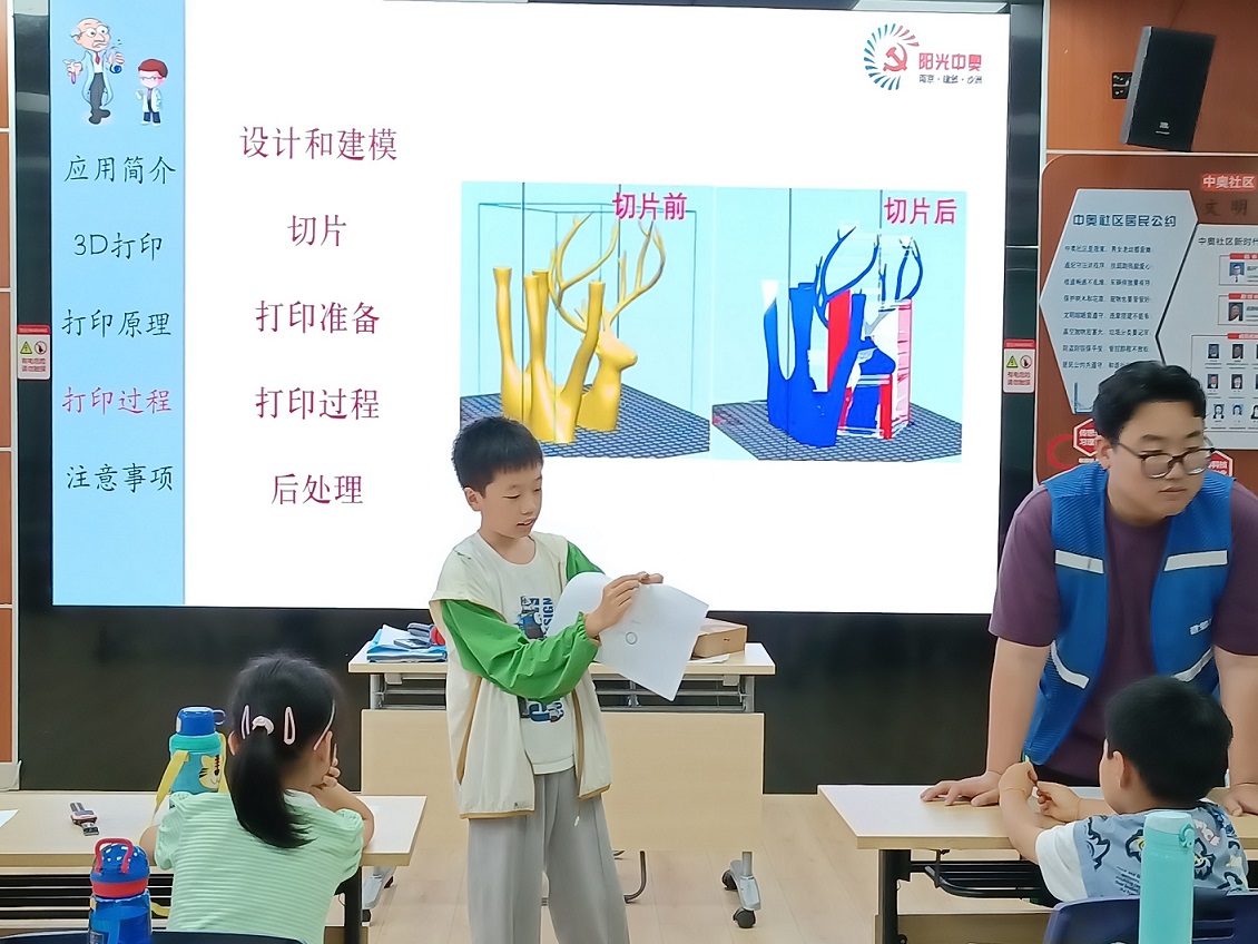 活动最后,孩子们亲手设计3D打印模型并切片展示。机器人、火箭、子弹、向日葵……中奥少年走上讲台与大家分享自己眼中的3D打印与创意方案,彰显少年小英才们的成长。