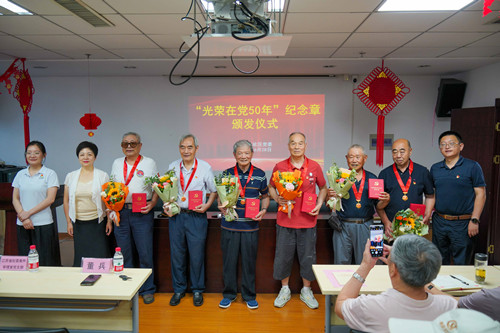 紧接着,在大家热烈的掌声中,南苑街道党工委委员、办事处副主任、联系点领导董兵同志为到场的6位“光荣在党50年”纪念章获得者代表颁发纪念章,并向所有荣获纪念章的老党员同志表示衷心的祝贺和敬意。