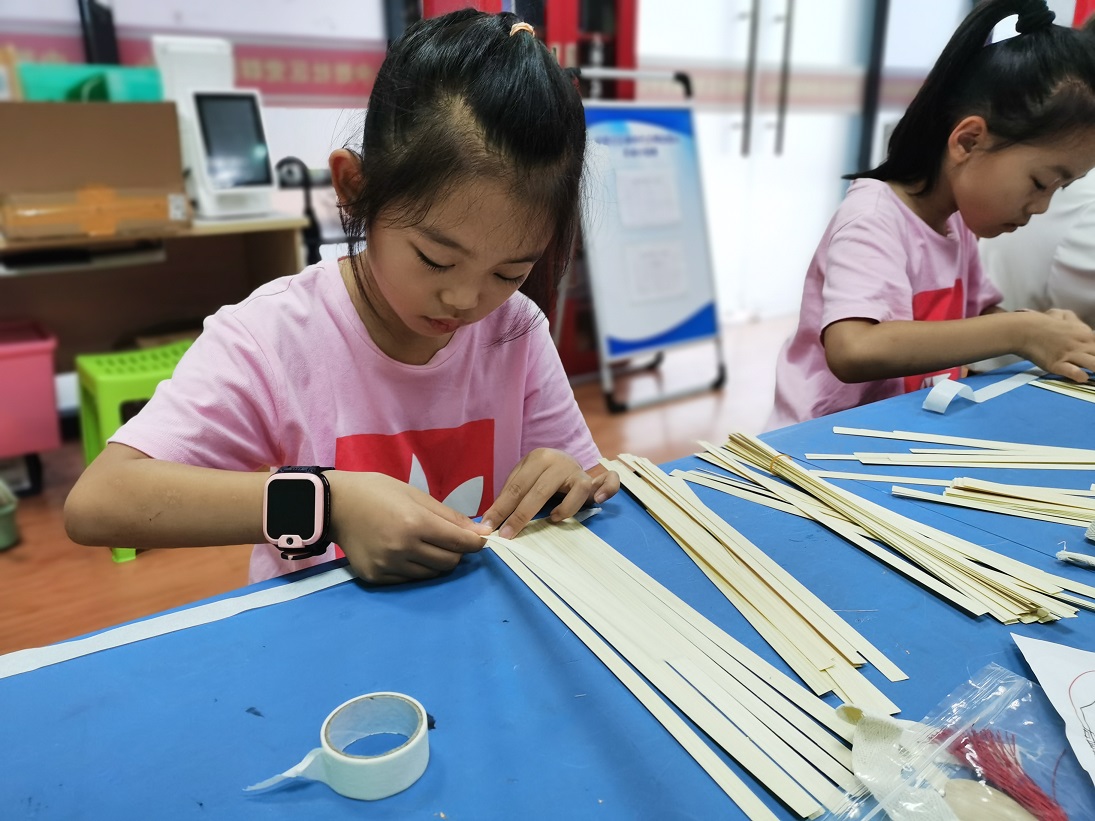 在动手制作环节,孩子们迫不及待地开始了自己的创作之旅。他们挑选竹条、摆正、编织,每一步都充满了热情和耐心。在老师的指导下,孩子们巧妙地运用竹条编织出一把把精美的竹编扇子。这些扇子不仅造型美观,而且实用性强,为炎炎夏日带来了一丝清凉。