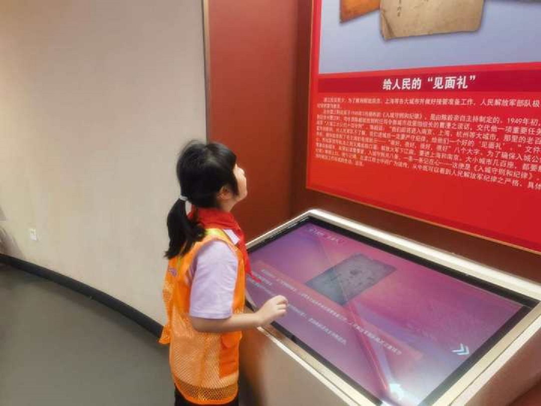 走进渡江胜利纪念馆,孩子们就被纪念馆的恢宏气势所震撼。跟随着讲解员的步伐,孩子们走进渡江胜利纪念馆主馆区。在讲解员的引导下,大家首先参观了主展厅。展厅内,一幅幅珍贵的历史照片,一件件珍贵的文物展品,生动再现了渡江战役的激烈战斗场景和人民解放军的英勇形象。孩子们仔细聆听讲解员解说渡江战役的全过程、革命先烈的壮烈事迹,驻足观看陈列的枪炮弹药、衣物鞋帽、文件器具等珍贵文物资料,切身感受着声、光、电等现代科技重现“钟山风雨起苍黄,百万雄师过大江”的壮观场景,仿佛穿越时空,回到了那个烽火连天的年代。在学史知史中重温革命先烈的英勇事迹,感受浓浓军民鱼水情,激发浓浓强国报国志。